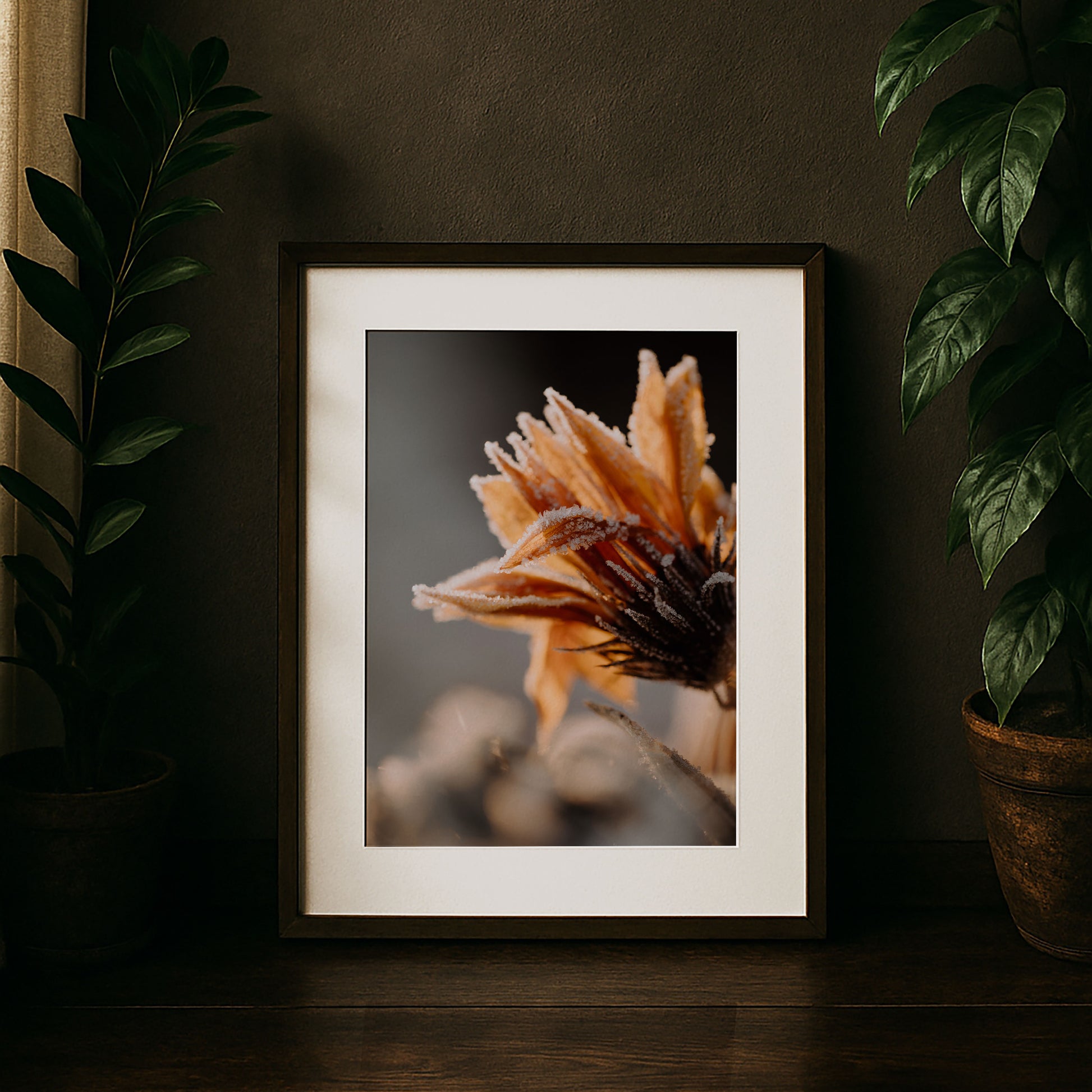 Am frühen Morgen liegt noch Frost auf den Blütenblättern. Das Licht der Sonne bricht sich in den feinen Kristallen und macht sie für einen Augenblick lebendig, als würde die Zeit kurz stillstehen. Etwas Vergängliches zeigt in diesem Moment seine ganze Schönheit – zart, verletzlich und doch voller Kraft. Für mich liegt darin die Erinnerung, dass Veränderungen nicht nur Abschied bedeuten, sondern auch den Anfang von etwas Neuem tragen. Dieses Bild bringt Ruhe, Wärme und die leise Stärke von Übergängen in einen Raum.