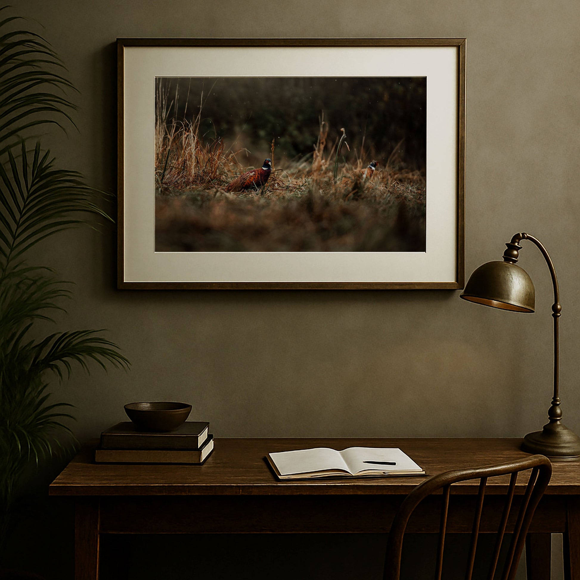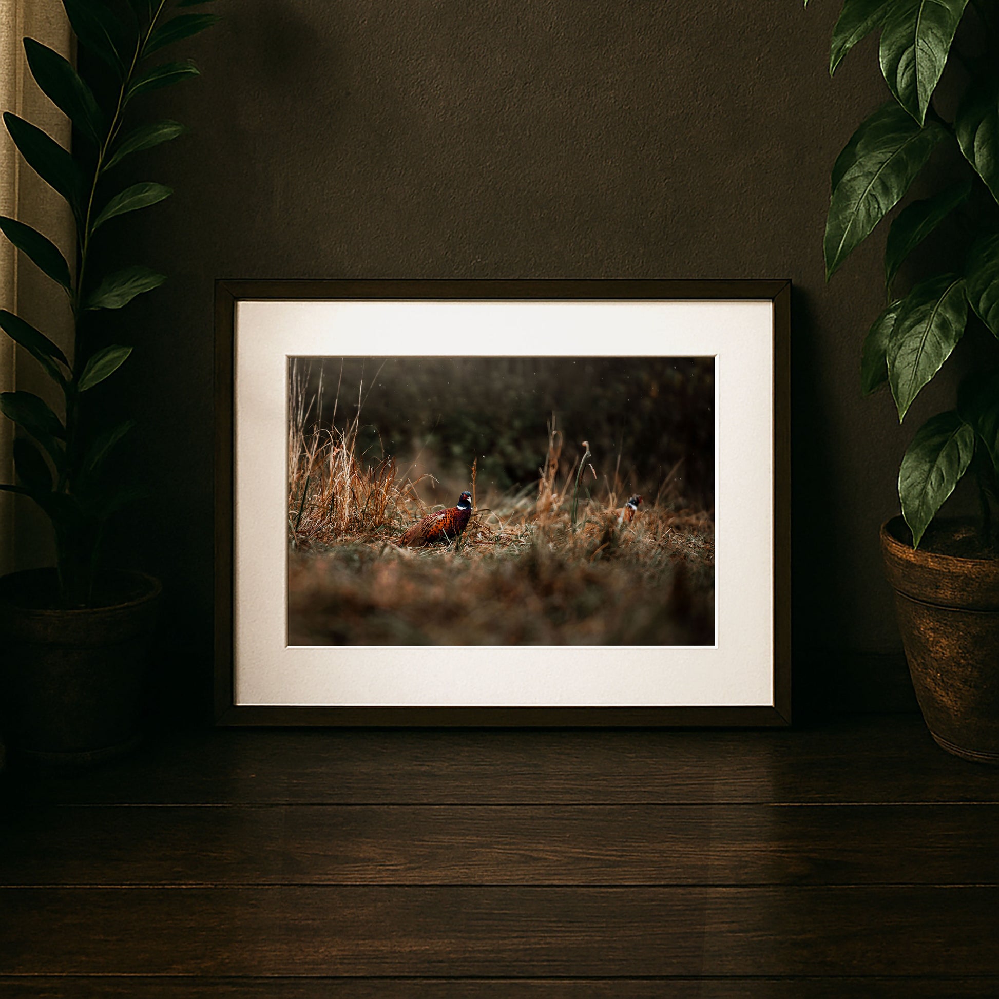 Ich habe diesen Fasan in einem herbstlichen Feld fotografiert, fast verborgen und doch im Mittelpunkt. Sein schimmerndes Gefieder hebt sich von den erdigen Tönen des trockenen Grases ab, kleine Regentropfen tanzen durch die Luft. Es war einer dieser Momente, die still und gleichzeitig voller Leben wirken – fast wie ein Märchenbild mitten im Alltag. Für mich steht dieses Bild für die Schönheit des Unerwarteten, für die kleinen Wunder, die man nur sieht, wenn man offen bleibt. Es bringt Wärme, Erdung und auch ein Stück Wildheit in einen Raum – für alle, die die Natur lieben und sich von ihren Farben überraschen lassen.
