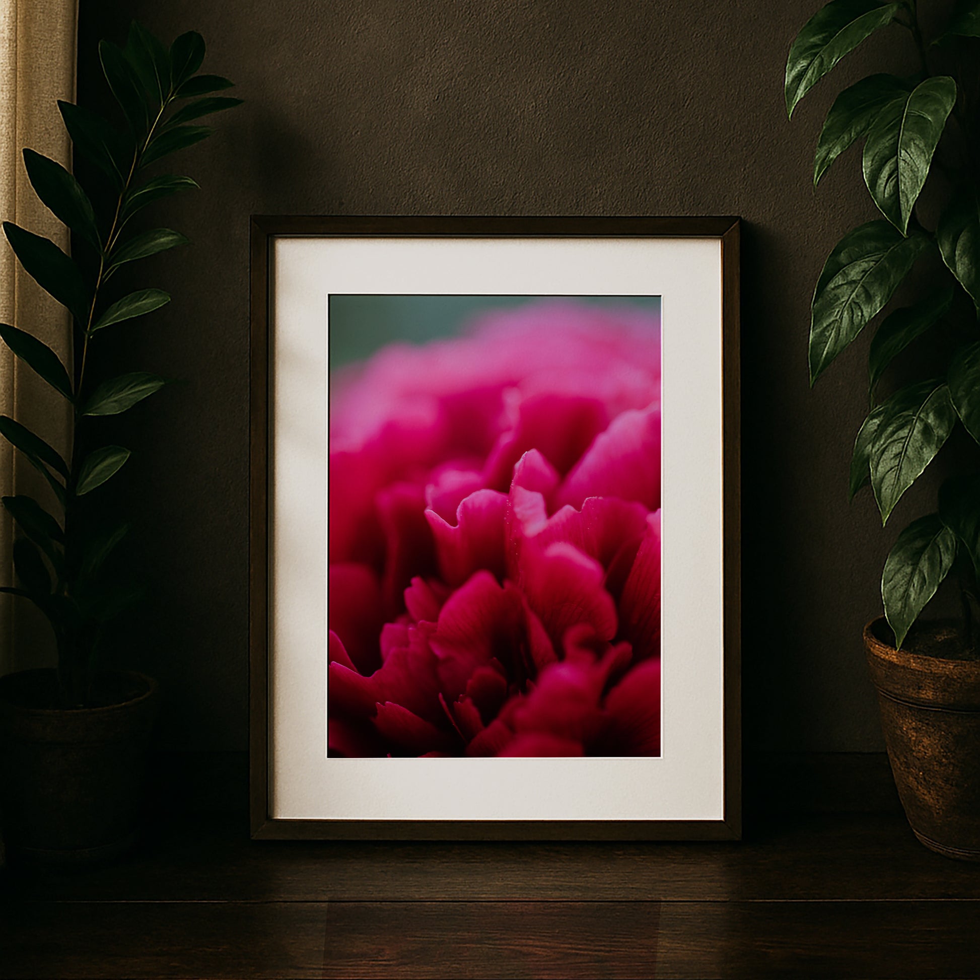 Ganz nah öffnet sich hier eine Pfingstrose, so nah, dass Formen und Farben fast abstrakt wirken. Die tiefen Rosétöne und das sanfte Licht legen sich wie ein leiser Mantel über die Blütenblätter, weich und doch voller Tiefe. Für mich steckt in diesem Moment etwas sehr Intimes – ein Blick in das Innere einer Blume, in ihre Zerbrechlichkeit und gleichzeitig ihre Kraft. Es ist kein inszeniertes Bild, sondern einfach das, was da war: Licht, Farbe, Nähe. Dieses Werk erinnert mich daran, langsamer zu werden und genau hinzusehen. Es bringt Wärme in einen Raum, eine stille Präsenz, die zugleich auffällt und beruhigt.